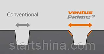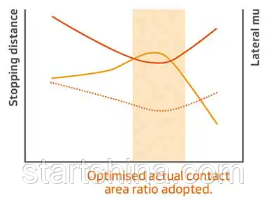 Глибина всіх канавок розрахована відповідно до їхнього розташування на протекторі для забезпечення оптимальної жорсткості й еластичності. Зведений до мінімуму компроміс між характеристиками на сухій і мокрій дорозі, щоб забезпечити баланс кожного з них.
